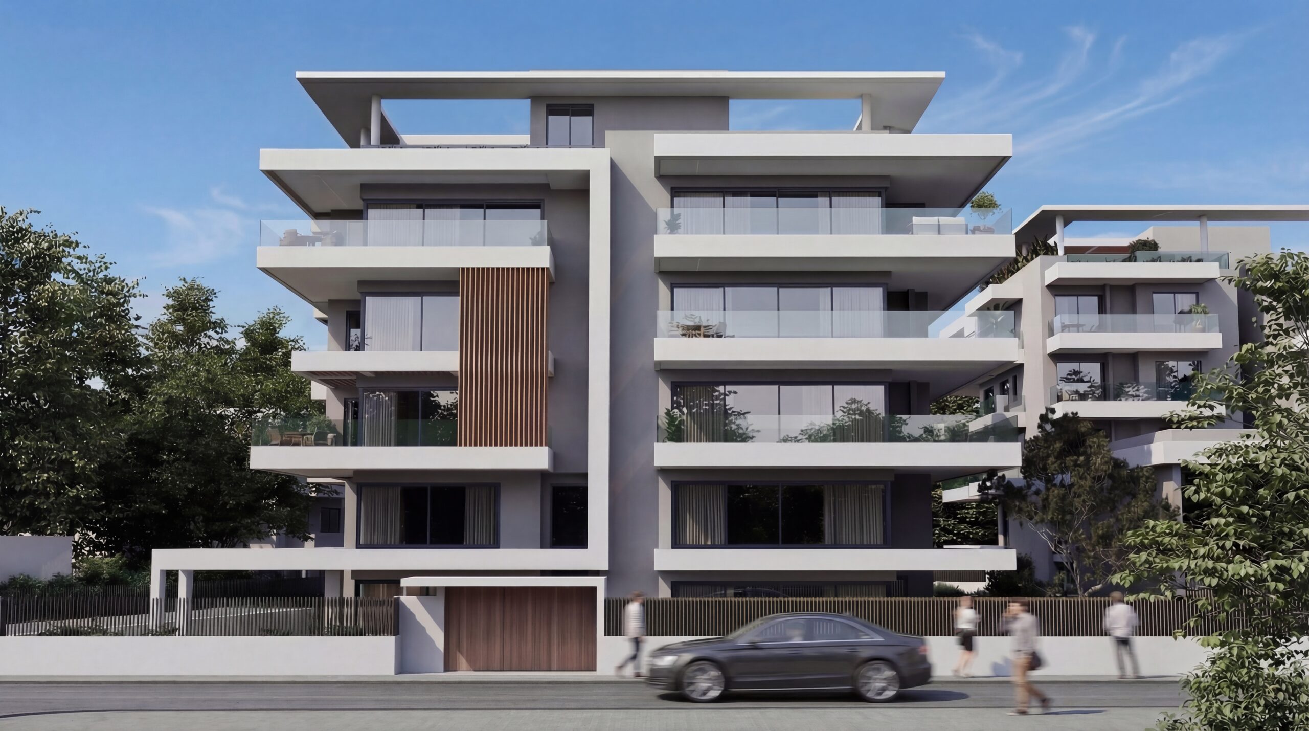 Σύγχρονο πενταώροφο κτίριο κατοικιών με minimal αρχιτεκτονική μεγάλες βεράντες και άνετους εσωτερικούς χώρους.